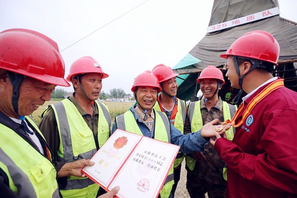 5月18日上午,在萧县旗杆楼铁矿钻探施工现场,安徽省能源化学地质工会副主席吴翠玉为325地质队汤磊鑫佩戴省“五一劳动奖章”,并颁发荣誉证书。