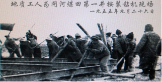 一九五五年九月二十六日己经深深嵌进325地质队的历史。濉溪县烈山陆庄,(今杨庄矿附近),一座钻塔屹立在田间,远处传来钻机的轰隆声响彻准北大地,钻头冲破土壤,缓缓潜入地层深处。这看似简单的一钻不但在淮北市历史上留下了浓墨重彩一笔,也拉开了开发淮北煤田序幕。一时,酣眠亿万年之久的闸河煤田受到了强烈震动。年度总进尺为一万八千米得到了地质部部长李四光的表杨,这一年地质队伍由最初的几十人发展到二百〇八人。